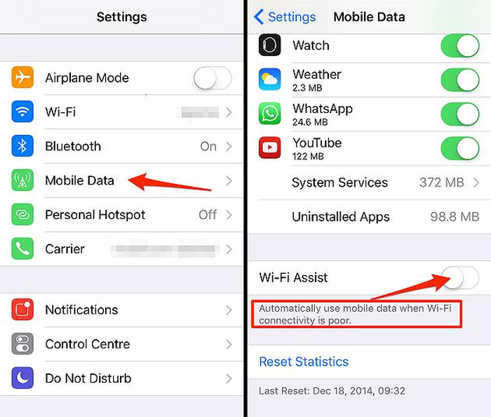 Bạn vào Cài đặt (setting) > Di động (Cellular) > kéo xuống và tắt Hỗ trợ WiFi (Wi-Fi assist). Đây là tính năng tự động bật mạng dữ liệu khi mạng WiFi yếu.