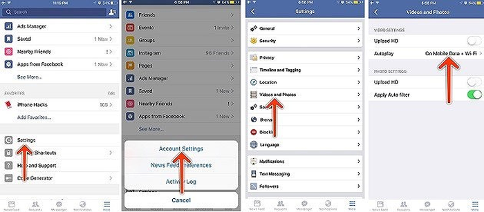 Mở Facebook > vào tab Menu > Setting & Privacy (cài đặt & riêng tư) > Account Settings (cài đặt tài khoản) > Videos and Photo > ở mục Autoplay (Tự động phát) bạn chuyển sang Never autoplay videos hoặc On Wi-Fi conections only.