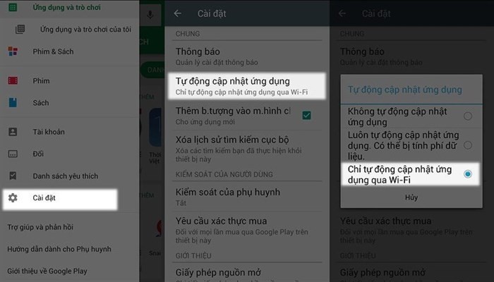 Chọn Cài đặt trong CH Play > Tự động cập nhật ứng dụng > Chỉ tự động cập nhật ứng dụng qua Wi-Fi để thiết lập tiết kiệm 3G.