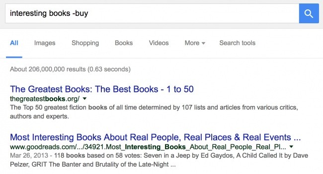 Để loại bỏ các từ tìm kiếm không quan trọng từ truy vấn của bạn, chỉ cần sử dụng dấu “-“ trước từ đó. Ví dụ bạn muốn tìm đọc những quyển sách hay mà không muốn mua chúng, bạn có thể gõ: Sách hay -mua.