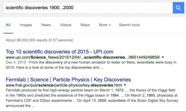 Đôi khi bạn cần tìm kiếm những sự kiện diễn ra trong một khoảng thời gian nhất định. Muốn làm vậy, bạn có thể thêm một khoảng thời gian vào tìm kiếm của mình, ngăn cách bởi dấu ba chấm. Ví dụ, nếu bạn muốn tìm kiếm những phát hiện khoa học diễn ra trong thế kỷ 20, bạn có thể gõ như thế này:
