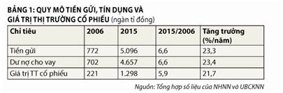 Tiền gửi tiết kiệm, dư nợ cho vay và giá trị thị trường cổ phiếu trong giai đoạn 2006-2015 đã tăng lần lượt là 6,6; 6,6 và 5,9 lần để đến cuối năm 2015 có độ lớn bằng 121%, 111% và 31% GDP (bảng 1). Như phân tích ở phần tiếp theo, do cả tiền gửi và cổ phiếu đều có suất sinh lợi thực âm, nên trên thực tế hệ thống tài chính và một bộ phận doanh nghiệp đã được những người có vốn “trợ cấp” rất lớn.