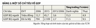 Số liệu trong bảng 2 cho thấy tăng trưởng GDP bình quân đầu người tính theo giá cố định bằng tiền đồng chỉ là 4,9%/năm. Tuy nhiên, do đồng tiền được định giá cao làm cho GDP bình quân đầu người quy đổi sang đô la Mỹ theo giá cố định tăng đến 9,5%/năm. “Nhờ” lạm phát cao mà GDP/người tính bằng đô la Mỹ vượt qua ngưỡng 2.000.