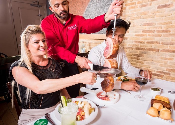 Trong một nhà hàng bít tết Brazil, khách hàng đến ăn phải sử dụng một mã thông báo để đặt hàng. Nếu người bồi bàn mang đến những món bạn muốn ăn thì bạn phải giữ mã thông báo của bạn trên bàn với mặt màu xanh lá cây. Nếu bạn không muốn nhiều thức ăn hơn thì hãy đổi thành mặt màu đỏ. Vì thịt có thể được phục vụ liên tục, bạn cần đặt mã thông báo của mình một cách khôn ngoan.