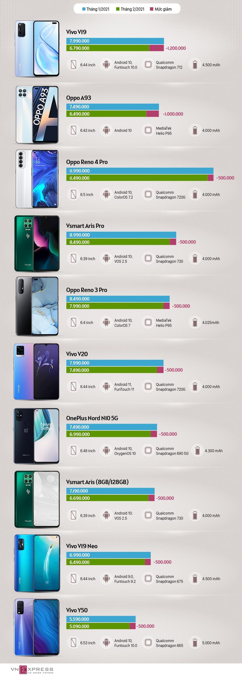 Smartphone của Vivo, Oppo, Vsmart có mức giảm nhẹ từ 500.000 đến hơn một triệu đồng.