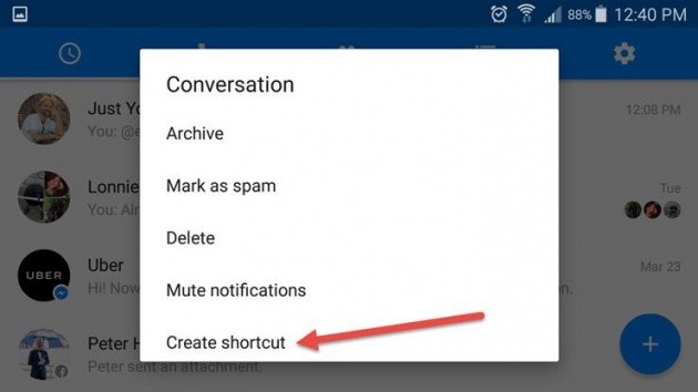 Đối với các thiết bị Android, bạn có thể tạo đường tắt cho cuộc hội thoại mình hay trò chuyện cùng bạn bè của mình ra ngoài màn hình để truy cập nhanh hơn. Bạn chỉ cần ấn và giữ cuộc hội thoại, chọn “Create shortcut” là được.