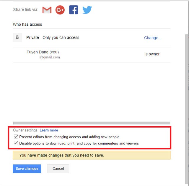 Bạn có thể ngăn không cho tải về hoặc in ấn tài liệu, slideshow hoặc bảng tính của mình chia sẻ với những người khác. Bạn còn có thể ngăn chặn khả năng sao chép văn bản hoặc các thành phần khác. Tính năng hạn chế này hơi khó tìm: Ở cửa sổ "Share with others", trong phần "Advanced".