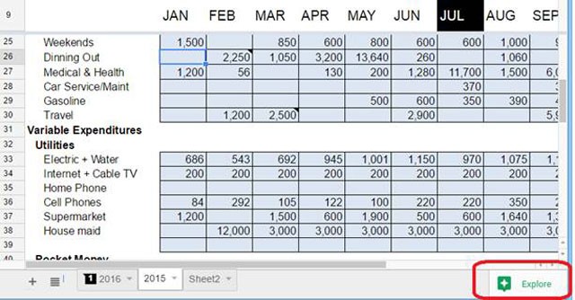 Google Sheets có một công cụ gọi là Explore tự động phân tích cột hoặc hàng để xác định có bất kỳ dữ liệu nào trên đó có thể trình bày dưới dạng biểu đồ không. Nếu có, một biểu tượng cùng với từ Explore màu xanh lá sẽ xuất hiện ở góc dưới bên phải của bảng tính (nếu không có, biểu tượng này chuyển sang màu xám). Nhấn vào nó, một khung cửa sổ sẽ mở ra bên phải bảng tính, hiển thị các biểu đồ tạo ra từ dữ liệu, bạn có thể bấm vào để xem ở kích thước lớn hơn hoặc kéo-thả vào bảng tính.