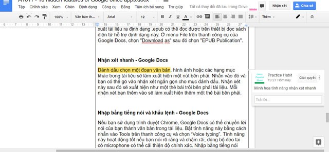 Đánh dấu chọn một đoạn văn bản, hình ảnh hoặc các hạng mục khác trong tài liệu sẽ làm xuất hiện một nút bên phải. Nhấn vào đó và bạn có thể gõ vào nhận xét ngắn gọn cho mục đánh dấu. Nhận xét này sau đó sẽ xuất hiện như một thẻ bài trôi bên phải tài liệu. Mỗi nhận xét bạn thêm vào sẽ làm xuất hiện thêm một thẻ bài bên phải.