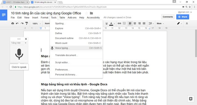 Nếu bạn sử dụng trình duyệt Chrome, Google Docs có thể chuyển lời nói của bạn thành văn bản trong tài liệu. Bật tính năng này bằng cách nhấn vào Tools trên thanh công cụ và chọn “Voice typing”. Tính năng này hoạt động tốt nếu bạn nói rõ ràng và chậm rãi, dùng bộ đeo tai có microphone có thể cải thiện độ chính xác. Nhập bằng tiếng nói của Google Docs nhận diện được hơn 40 ngôn ngữ. Bạn thậm chí có thể ra lệnh chỉnh sửa và định dạng tài liệu, cũng như các lệnh điều hướng bằng tiếng nói. Công cụ này nhận diện một số cụm từ là lệnh, khi đó sẽ tạm dừng việc ghi chép để thực hiện: "select word” (chọn từ), "select all” (chọn tất cả), "align right” (canh phải), "go to end of page” (đi đến cuối trang), v.v ...