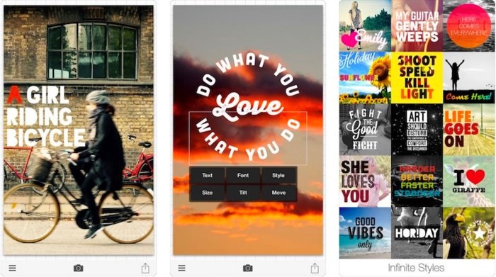 Phonto cho phép bạn chèn thêm text vào các bức ảnh và video của bạn. Ứng dụng cung cấp hơn 400 phông chữ, bạn có thể sử dụng các màu và kích cỡ khác nhau. Hơn nữa, bạn có thể thay đổi phông nền của text và thực hiện nhiều thay đổi hơn cho văn bản trước khi thêm chúng.