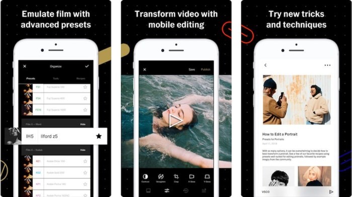 VSCO là ứng dụng chỉnh sửa ảnh sáng tạo với giao diện đơn giản. Chúng cho phép bạn thiết lập các thông số như màu sắc hình ảnh, độ phơi sáng và có sẵn các tính năng chỉnh sửa video bao gồm độ tương phản, cắt gọt và nhiều công cụ khác. Giống như những ứng dụng khác trong danh sách này, bạn có thể tạo, lưu và sử dụng các những thiết lập đặt trước. Tuy nhiên, ứng dụng cung cấp một tính năng độc đáo của mạng lưới các nhà sáng tạo bao gồm cả những nhiếp ảnh gia chuyên nghiệp.