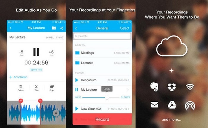Dùng Recordium thay vì Voice Memos: Voice Memos của Apple rất hay, cung cấp cho bạn một cách tuyệt vời để tổ chức hoặc chú thích tất cả các bản ghi âm. Tuy nhiên, Recordium còn cho phép bạn chỉnh sửa clip ngay trong ứng dụng và chú thích vào bất cứ phần nào trong bản ghi âm. Thậm chí ứng dụng này còn đồng bộ với dịch vụ lưu trữ đám mây như Google Drive hoặc Dropbox.Recordium Pro có giá 9,99 USD.