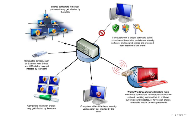 Sâu máy tính lớn nhất lịch sử đã nhiễm độc hàng chục triệu máy tính Windows tại hơn 200 quốc gia. Máy tính của chính phủ Anh bị thiệt hại nặng nề. Điều khiến Conficker khó ngăn cản là nó nhiễm độc một máy rồi phát tán sang các máy khác cùng mạng lưới một cách tự động mà không có bàn tay của con người. Sau đó, nó vô hiệu hóa các dịch vụ hệ thống, phần mềm bảo mật quan trọng, tự tải về các tập tin và cản trở người dùng truy cập website để tải bản cập nhật bảo mật.