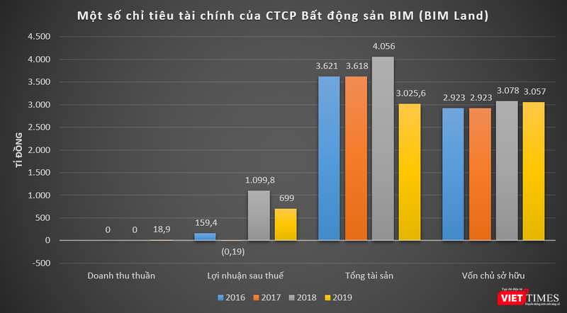 Trong giai đoạn 2016 - 2019, các chỉ tiêu kinh doanh của BIM Land (công ty mẹ) có nhiều biến động. Dù không phát sinh doanh thu, song năm 2018 doanh nghiệp này bất ngờ báo lãi sau thuế gần 1.100 tỉ đồng, trong khi năm 2017 báo lỗ 0,19 tỉ đồng.