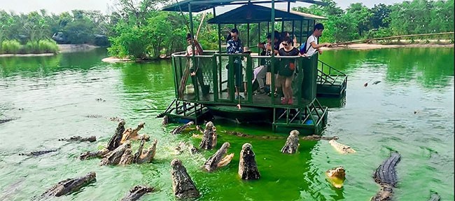 Trong Vương quốc voi, Thái Lan, tại một trang trại cá sấu, chủ sở hữu cho thuê một không gian bán khép kín nhỏ cho khách du lịch đến thăm, xem và cho cá sấu ăn! Chiếc bè là một mảnh gỗ mỏng được cân bằng trên các thùng nhựa và có một nửa bao vây xung quanh nó. Cái lều cũng có mái. Những người ở bên trong được cung cấp cần câu để nuôi cá. Thức ăn họ sử dụng là thịt bò. Các con cá sấu nhảy ra khỏi mặt nước đớp thức ăn. Có những khách du lịch còn trêu chọc những con cá sấu bằng cách đung đưa miếng thịt trước mặt chúng. Một kiểu du lịch vô cùng nguy hiểm.