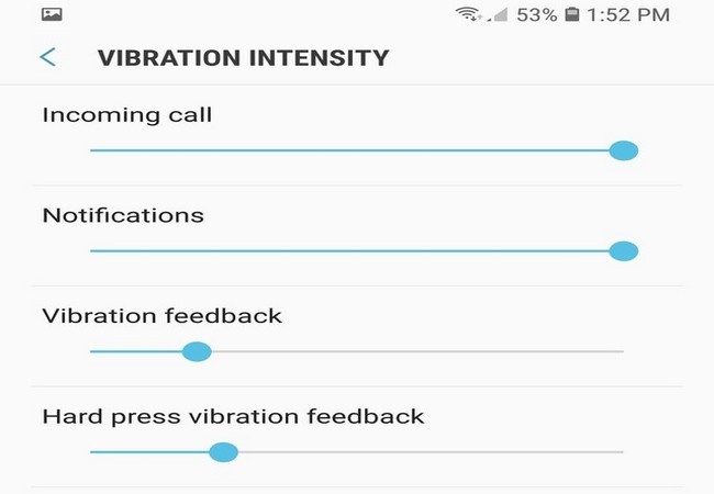 Tuy nhiên, người dùng có thể thay đổ độ rung này bằng cách vào Settings > Sounds and vibration > Vibration Intensity (Cài đặt > Âm thanh và rung > Cường độ rung). Khi đó, bạn có thể giảm cường độ rung khi có cuộc gọi đến, có thông báo hay chạm vào màn hình mở.