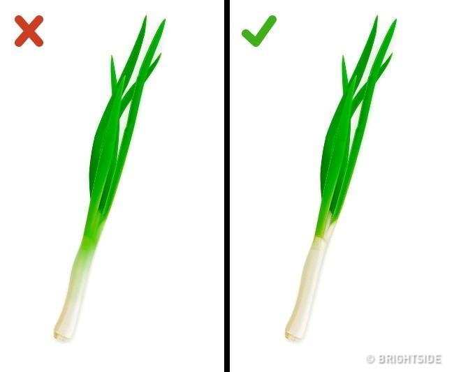 Hãy nhìn vào phần nối tiếp giữa phần trắng và xanh của hành lá: nếu giữa đó có sự khác biệt thì đó là loại tốt còn nếu nó ngả màu dần dần, cây hành đó đã để lâu rồi.