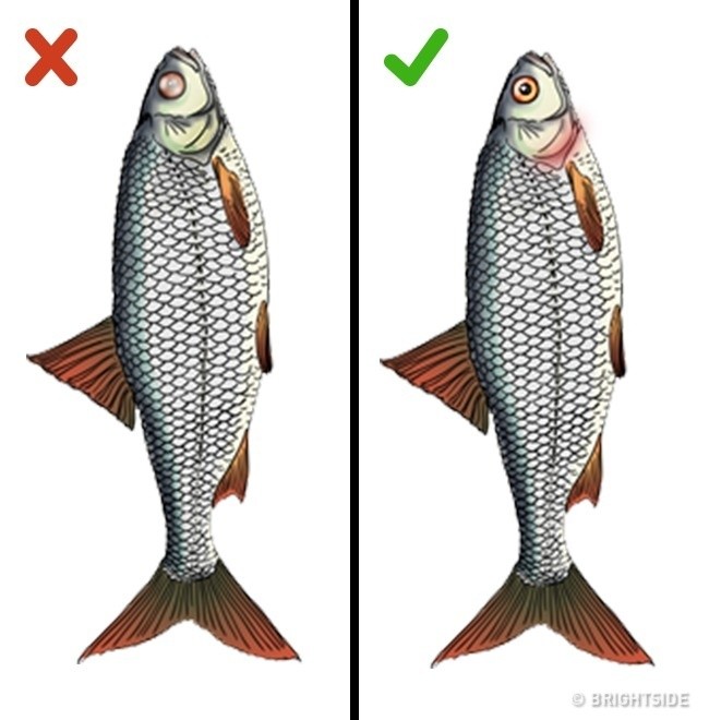 Một con cá tươi có mắt sáng; mắt mờ và phồng lên là dấu hiệu của một con cá ươn. Mang cá phải có màu đỏ tươi hoặc màu hồng nhạt (trong trường hợp máu chảy qua mang).