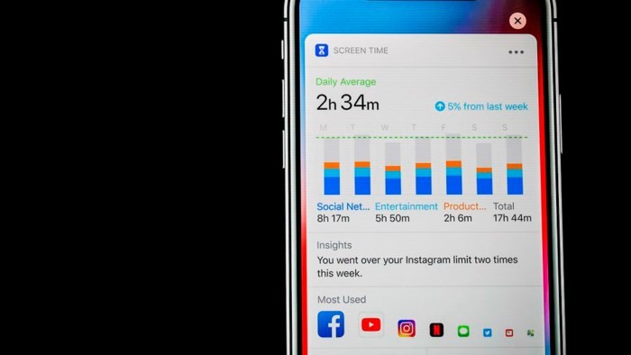 Screen Time: Tính năng này giúp người dùng quản lý thời gian sử dụng thiết bị một cách hiệu quả, cân bằng sức khỏe tốt hơn. Thậm chí tính năng này sẽ cho bạn biết tần suất bạn nhấc điện thoại lên, số lượng cảnh báo bạn nhận được và tần suất bạn mở khóa điện thoại.