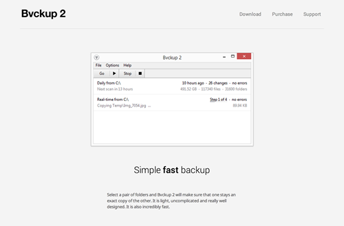 Bvckup 2 là phần mềm chuyên tạo ảnh nội dung của một thư mục nào đó sang một thư mục khác, có thể thư mục đó lưu trên ổ cứng trong máy tính hay một thư mục trên mạng. Được thiết kế tập trung vào tính ổn định và tốc độ nên điểm sáng của ứng dụng này là hoạt động rất nhanh và mượt mà. Bvckup 2 dùng một engine có thể nhận diện và chỉ sao chép những phần được thay đổi trong một file. Một engine I/O đồng bộ hỗ trợ bộ xử lý đa luồng và sao chép cả những file bị khóa. Bạn có thể lên lịch sao chép hàng loạt hoặc thiết lập đồng bộ theo thời gian thực.