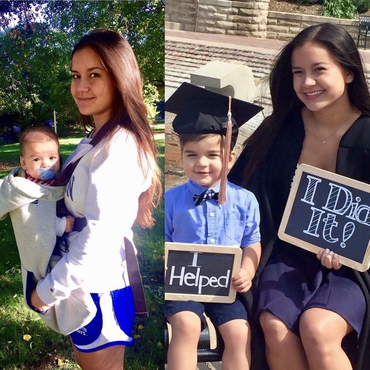 6. Hình ảnh người mẹ đơn thân vào năm 2012 - năm thứ hai đại học; và vào năm 2016, cô ấy tốt nghiệp đại học.