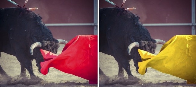 Thực tế, bò đực không thấy màu sắc, chúng chỉ thấy chuyển động. Chúng sẽ bị kích thích khi nhìn thấy một mảnh vải trước mặt.