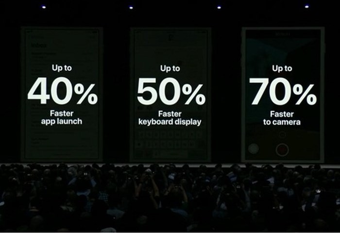 1. Tăng tốc iPhone cũ. Theo Apple, iOS 12 giúp cho các dòng điện thoại cũ như iPhone 6+ trở nên nhanh chóng hơn nhiều: mở ứng dụng nhanh hơn 40%, mở bàn phím nhanh hơn 50%, và cải thiện 70% tốc độ mở máy ảnh.