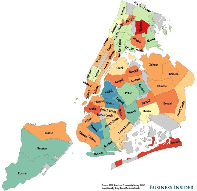 Nhìn vào bản đồ New York có thể thấy sự đa dạng về ngôn ngữ ở đây, đặc biệt là thứ ngôn ngữ phổ biến nhất không phải là tiếng Anh
