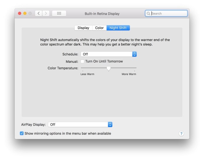 Sau khi hoàn tất cập nhật, bạn có thể kích hoạt Night Shift thông qua phần Displays của System Preferences. Mặc định, tính năng này được thiết lập tự động bật vào lúc Mặt Trời lặn (Sunset) và tự động tắt vào lúc Mặt Trời mọc (Sunrise).