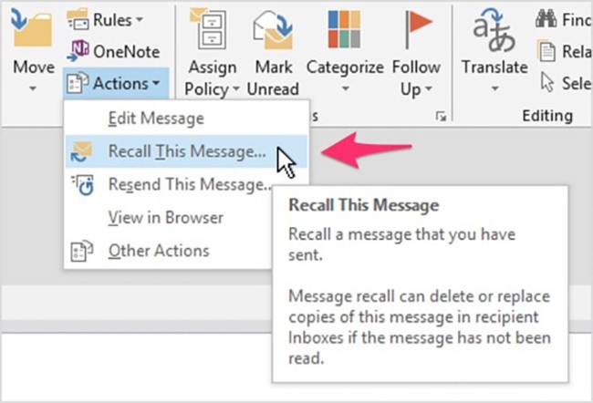 Nếu đang sử dụng Outlook (tài khoản Exchange), bạn có thể lấy lại email đã gửi bằng cách bấm vào mục Send Items và chọn email cần lấy lại. Trong cửa sổ mới hiện ra, người dùng chỉ cần kích vào nút Actions trên thanh menu và chọn Recall This Message. Lúc này, bạn sẽ có hai lựa chọn cho việc thu hồi, đơn cử như xóa email hoặc thay thế bằng một email mới.