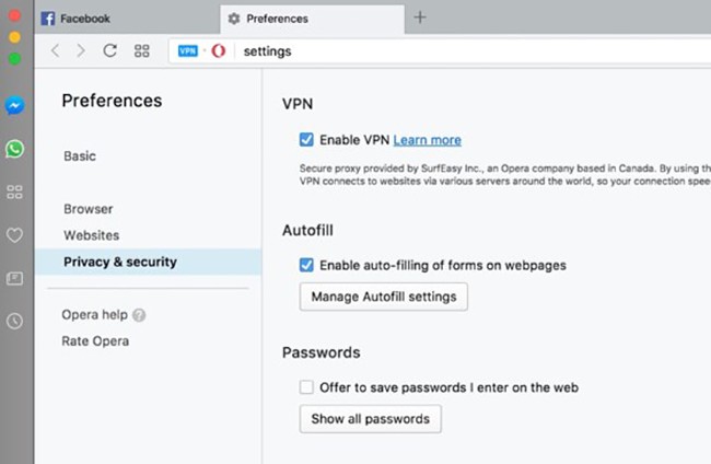Đầu tiên, bạn hãy tải và cài đặt trình duyệt Opera cho máy tính tại địa chỉ http://www.opera.com/vi, ứng dụng tương thích với các thiết bị chạy Windows và macOS. Tiếp theo, bạn truy cập vào phần cài đặt ứng dụng, tìm đến mục Privacy & security > Enable VPN. Lúc này trên thanh địa chỉ sẽ xuất hiện thêm tùy chọn VPN, người dùng chỉ cần kích hoạt và lựa chọn máy chủ tương ứng.