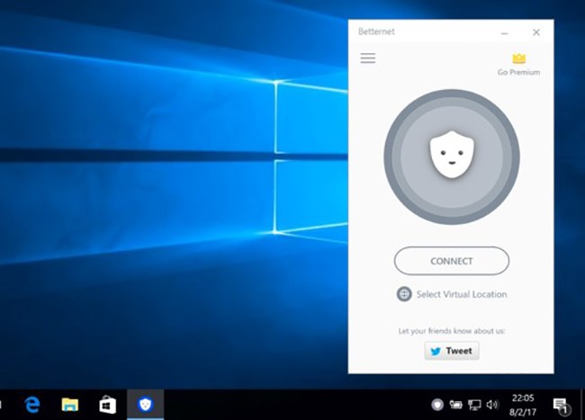Ngoài ra, bạn cũng có thể cài đặt thử ứng dụng VPN miễn phí như Betternet tại địa chỉ https://www.betternet.co/ > Get Betternet. Khi hoàn tất, người dùng chỉ cần mở ứng dụng, bấm Connect để kết nối đến máy chủ. Nếu muốn thay đổi vị trí, bạn hãy nhấp vào tùy chọn Select Virtual Location ở ngay bên dưới và làm theo các bước hướng dẫn.