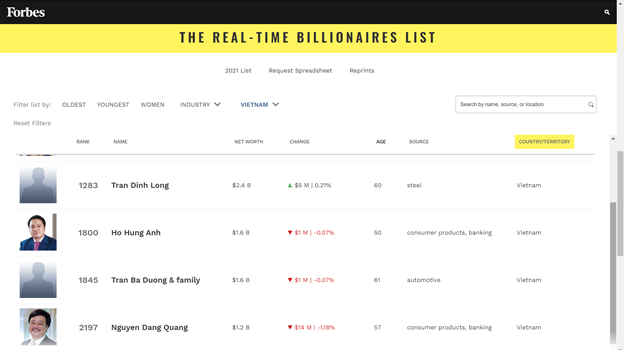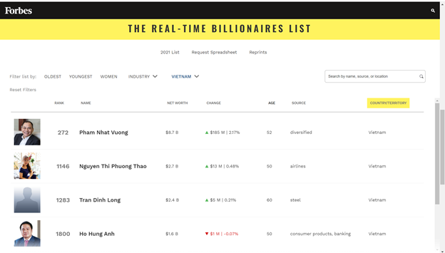 Dựa trên Bảng xếp hạng tỉ phú theo thời gian thực của Forbes tối ngày 6.4.2021, thông tin của sáu tỉ phú đô la người Việt như sau: