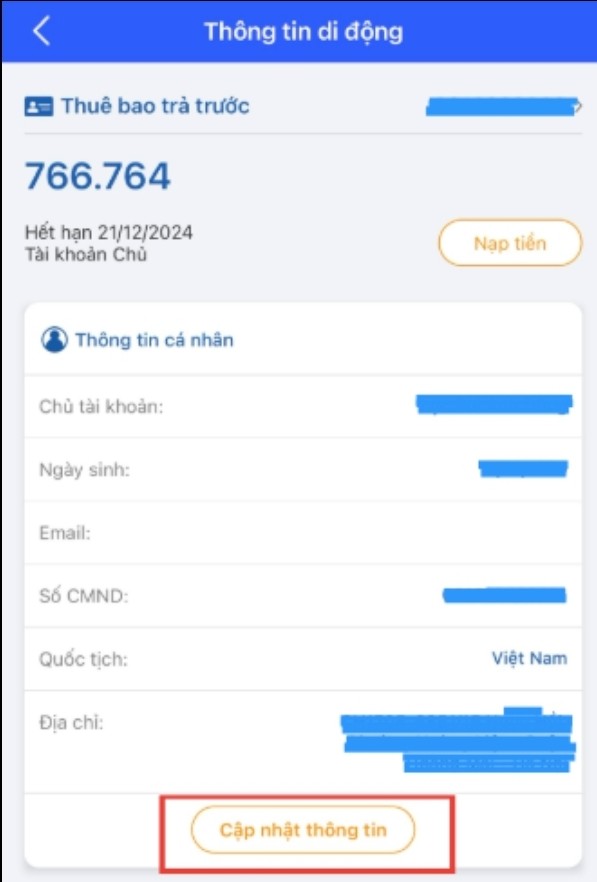 - Đối với các khách hàng thuộc đối tượng phải chuẩn hóa/so khớp thông tin thuê bao thì sẽ có tùy chọn "Cập nhật thông tin”, khách hàng bấm vào và làm theo hướng dẫn.