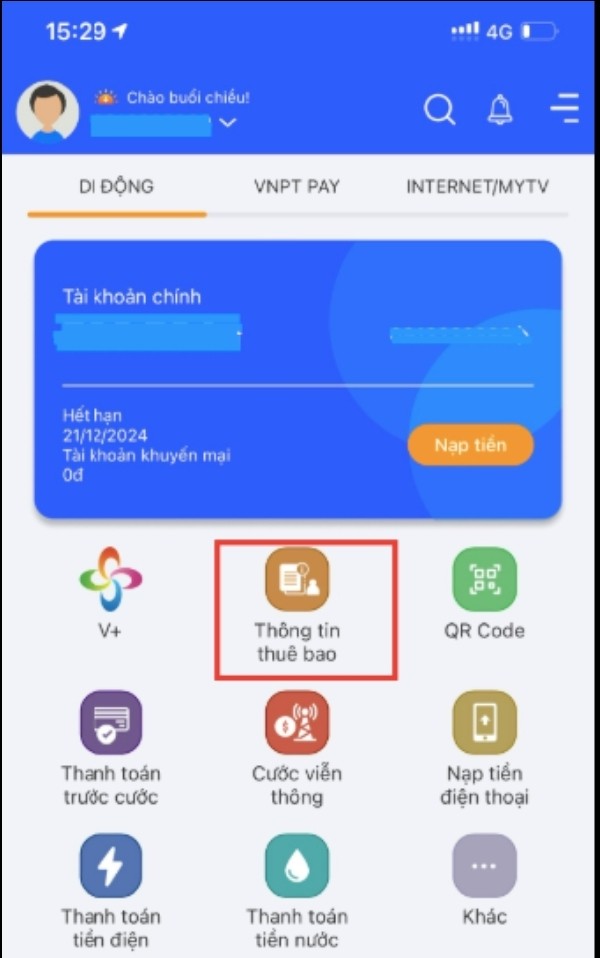 - Tại giao diện chính chọn mục “Thông tin thuê bao”