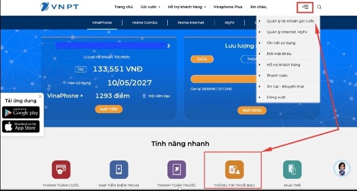 - Sau khi đăng nhập, khách hàng chọn mục “Thông tin thuê bao” hoặc chọn mục “Thông tin thuê bao” hoặc chọn Menu/Quản lý tài khoản gói cước Thông tin cá nhân.