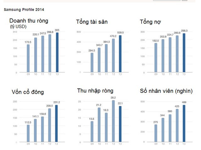 Một số chỉ tiêu tài chính của Samsung trong giai đoạn 2009 - 2013 (Nguồn: Samsung website)