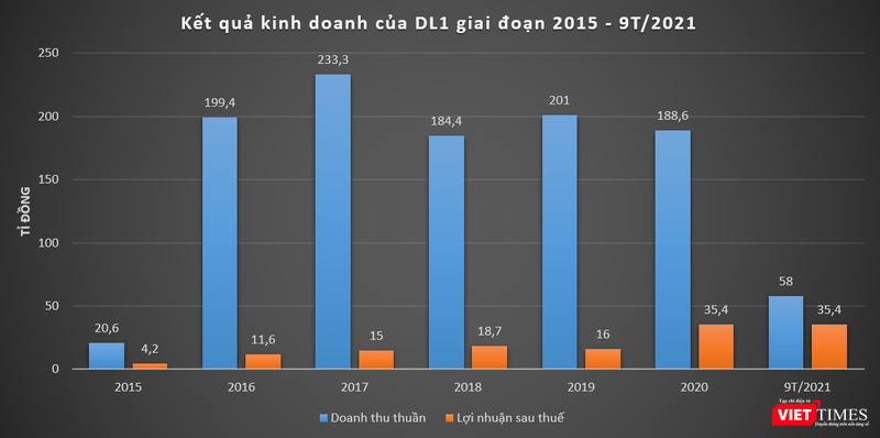 Lũy kế 9 tháng đầu năm 2021, DL1 ghi nhận doanh thu thuần đạt 58 tỉ đồng, giảm 38,5% so với cùng kỳ năm trước. Lợi nhuận sau thuế lũy kế đạt 35,4 tỉ đồng, tăng 57,6% so với cùng kỳ năm 2020.