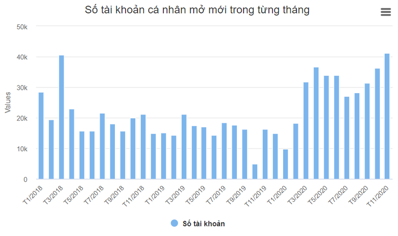 Tuy nhiên, "kỷ lục" về số nhà đầu tư cá nhân không chỉ là thành tích của tháng 11 mà đã xuất hiện liên tục từ tháng 3 năm nay. Đồ thị về số lượng tài khoản mở mỗi tháng trong nửa cuối năm nay gấp đôi so với mức trung bình năm trước.