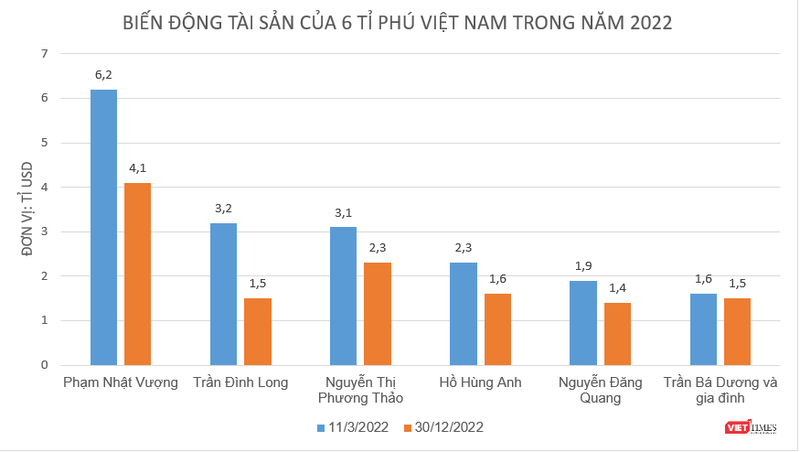 Nhưng đến ngày 30/12/2022, danh sách này chỉ còn lại 6 gương mặt, với tổng tài sản đạt 12,4 tỉ USD, 'bốc hơi' 5,9 tỉ USD so với đầu năm.