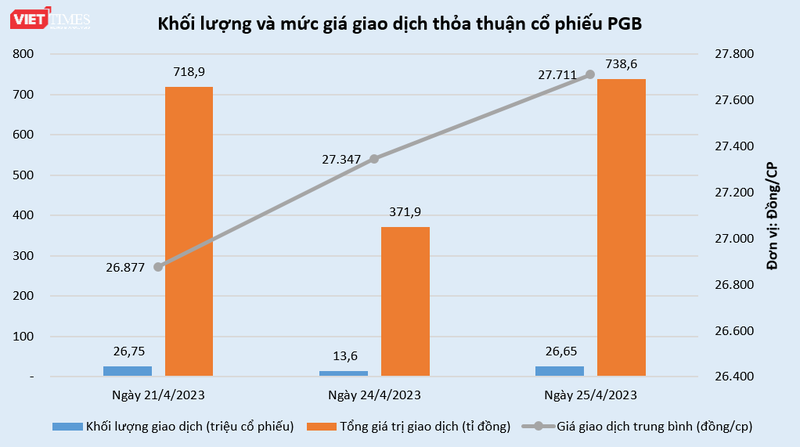 Theo thống kê của VietTimes, trong 3 phiên giao dịch liên tiếp (gồm 21, 24 và 25/4), có tới 77 triệu cổ phiếu PGB, tương đương 22,3% vốn điều lệ của Ngân hàng TMCP Xăng dầu Petrolimex (PG Bank), được sang tay qua phương thức thỏa thuận. Tổng giá trị của các giao dịch này lên tới 1.829,2 tỉ đồng.