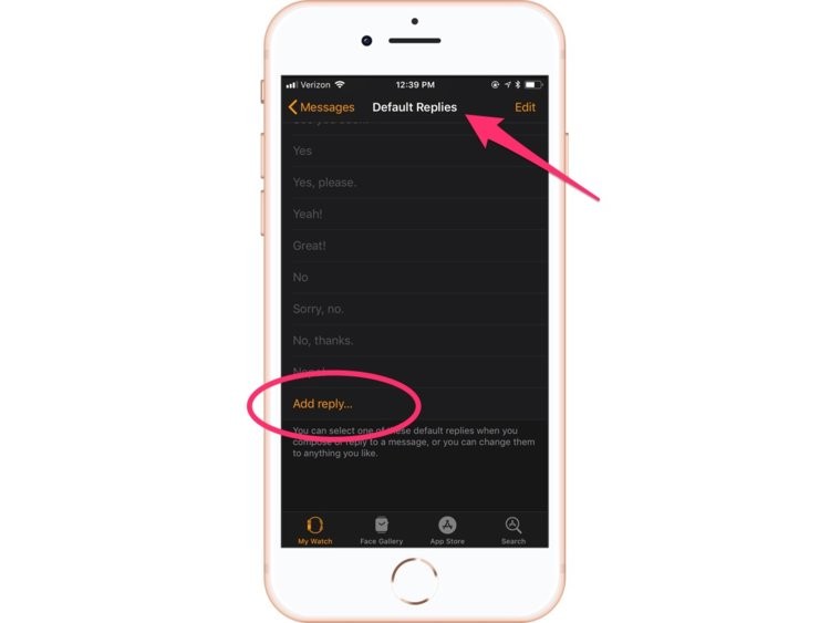 Mở ứng dụng Watch, sau đó đi tới My Watch > Messages > Default Replies (Trả lời mặc định). Cuộn xuống dưới cùng và bạn sẽ thấy tùy chọn thêm câu trả lời tùy chỉnh.