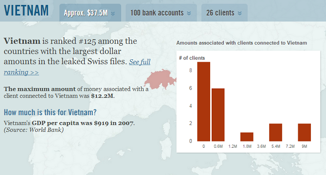 Theo đó, 26 khách hàng liên quan đến Việt Nam có mặt trong danh sách này, với tổng tài sản 37,5 triệu USD. Trong số này có 12% có hộ chiếu (hoặc quốc tịch) là Việt Nam và người có tài sản lớn nhất là 12,2 triệu USD.