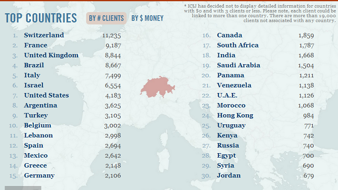 Trong danh sách này, các chủ tài khoản từ Thụy Sĩ đông nhất với 11.235 người, sở hữu 31.2 tỷ USD. Các tài khoản từ Anh, Venezuela, Mỹ và Pháp đứng tiếp theo trong các danh sách này.
