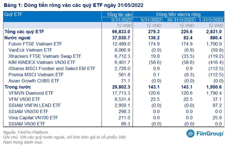 Dữ liệu của FiinTrade cho thấy, trong tháng 5/2022, các quỹ ETF đầu tư vào cổ phiếu Việt Nam ghi nhận mức vào ròng khoảng 2.831 tỉ đồng, gấp gần 1,5 lần so với giá trị vào ròng của 4 tháng đầu năm nay.