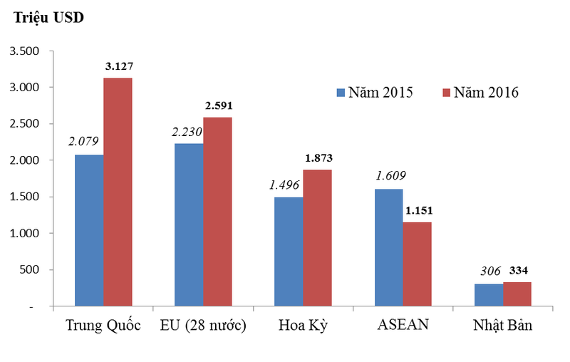 Thị trường xuất khẩu: Thị trường xuất khẩu năm 2016 của Việt Nam vẫn chủ yếu tập trung ở khu vực Châu Á với kim ngạch hơn 85,28 tỷ USD, chiếm 48,3% tổng kim ngạch xuất khẩu của cả nước. Trong đó nổi bật như: thị trường Trung Quốc với kim ngạch hơn 21,97 tỷ USD, tăng 28,4% so với cùng kỳ năm trước, chiếm tỷ trọng 12,4% tổng kim ngạch xuất khẩu của cả nước; thị trường Nhật Bản đạt gần 14,68 tỷ USD, tăng 3,9%, chiếm tỷ trọng 8,3%; Hàn Quốc đạt gần 11,42 tỷ USD, tăng 28%, chiếm tỷ trọng 6,5%; ...
