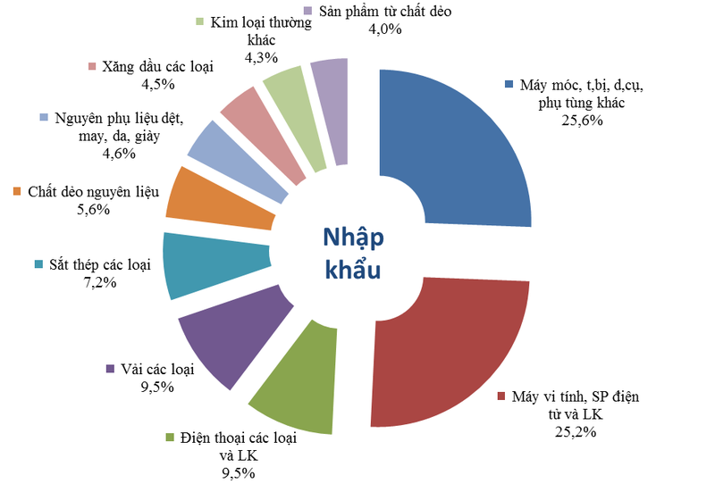Năm 2016, kim ngạch nhập khẩu 10 nhóm hàng chủ yếu đạt 110,78 tỷ USD, chiếm 63,6% trong tổng kim ngạch nhập khẩu chủ yếu của cả nước. Trong đó, lớn nhất là nhóm hàng máy móc, thiết bị, dụng cụ, phụ tùng khác (hơn 28,37 tỷ USD) tiếp theo là là máy vi tính, sản phẩm điện tử và linh kiện (hơn 27,87 tỷ USD); điện thoại các loại và linh kiện (hơn 10,56 tỷ USD), vải các loại (hơn 10,48 tỷ USD)...