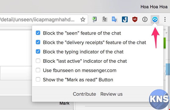 - Bước 2: Khi hoàn tất, biểu tượng của tiện ích sẽ nằm ở cuối thanh địa chỉ. Tại đây sẽ bao gồm một số tùy chọn như Block the “seen” feature of the chat (tắt tính năng “đã xem”), Block the typing indicator of the chat (tắt tính năng “đang trả lời”), Block “last active” indicator of the chat (tắt thời gian xuất hiện lần cuối trên Messenger)… và một số tùy chọn khác mà bạn có thể tìm hiểu thêm trong quá trình sử dụng.