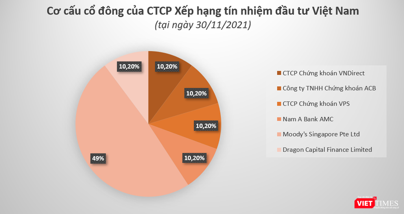Dữ liệu của VietTimes cho thấy, VIS Rating được sáng lập bởi 6 thể nhân, dẫn đầu là Moody’s Singapore Pte Ltd với tỉ lệ sở hữu 49% vốn điều lệ. Tiếp đến là Dragon Capital Finance Limited, chiếm tỉ lệ sở hữu 10,2% vốn điều lệ. Số cổ phần còn lại của VIS Rating được chia đều cho các ‘tay chơi’ trong nước, bao gồm: CTCP Chứng khoán VNDirect (Mã CK: VND), Công ty TNHH Chứng khoán ACB (ACBS), Công ty TNHH MTV Quản lý nợ và khai thác tài sản – Ngân hàng TMCP Nam Á (Nam Á AMC) và CTCP Chứng khoán VPS (VPS).
